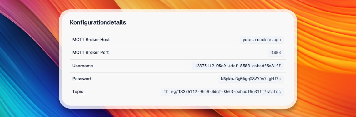 Gateway-Erstellung und -Konfiguration - Erstelle neue Gateways direkt in ROOCKiE und sehe die vollständige MQTT-Konfiguration auf einen Blick. Die übersichtliche Darstellung aller Verbindungsparameter macht die Einrichtung transparent und nachvollziehbar.